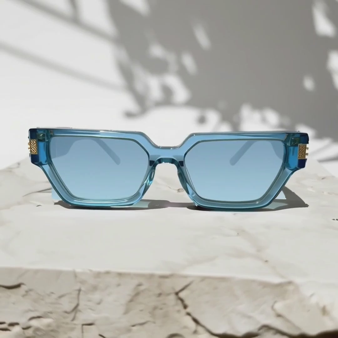 A bold rectangle frame in crystal-blue acetate with golden accents and textured temples. Sleek, geometric lines make it a statement piece from day to dusk.